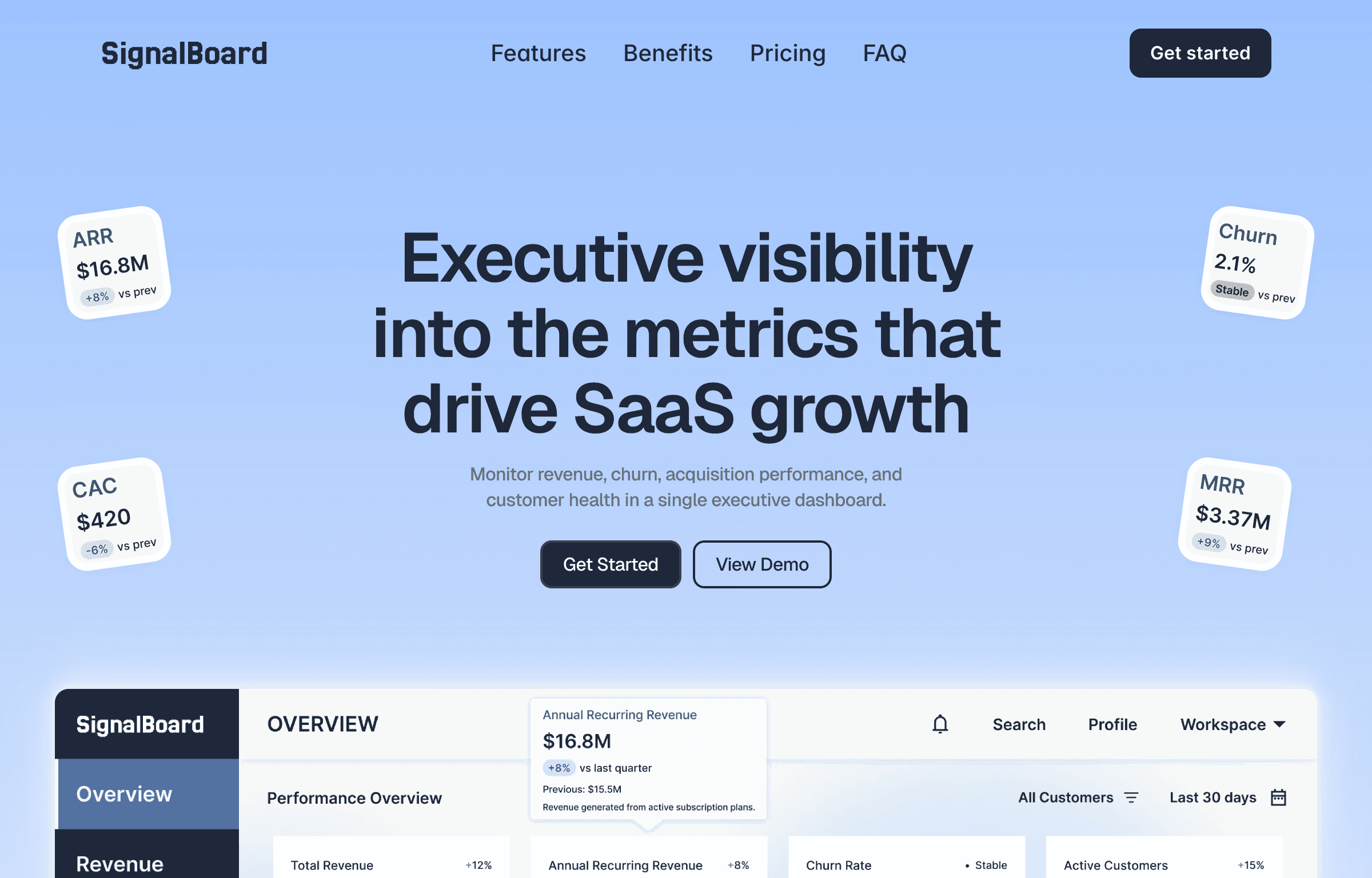 Separate revenue, customer growth, retention, and acquisition data into focused views that reduce cognitive load.